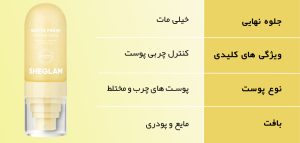 مدل MATTE FRESH از اسپری فیکس شیگلم مخصوص افرادی طراحی شده است که دارای پوست چرب یا مختلط هستند و به دنبال محصولی برای کنترل چربی پوست و جلوگیری از برق افتادن آرایش در طول روز میباشند. این اسپری با فرمولاسیون ویژه خود، علاوه بر تثبیت آرایش، جلوهای مات و طبیعی به پوست میبخشد.